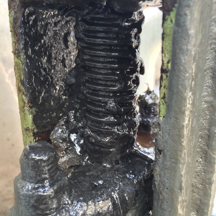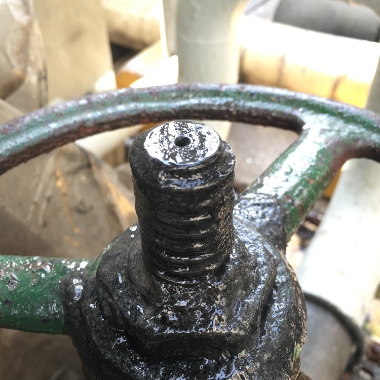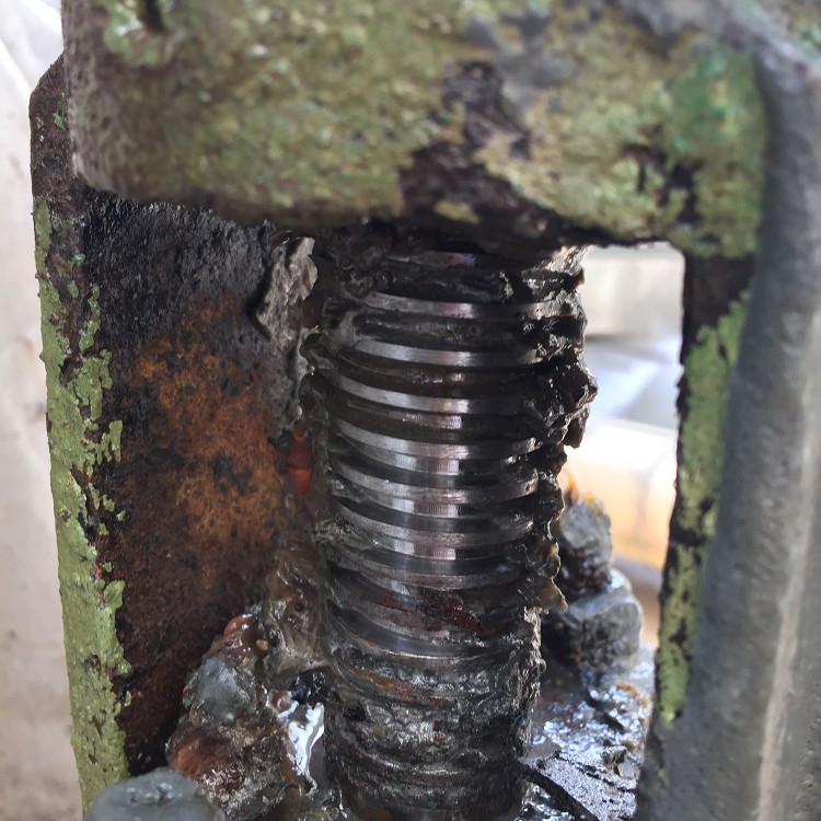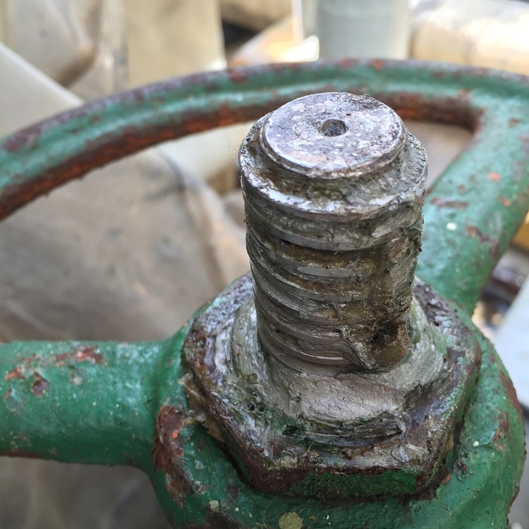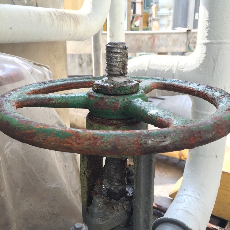水閘門手動閥門卡死無法轉動,廠區告知約2-3年沒有碰過手動閥門,因電動控制系統出現異常,因此必須人工開關閘門但因時間過長未曾保養螺桿造成無法順利開關。